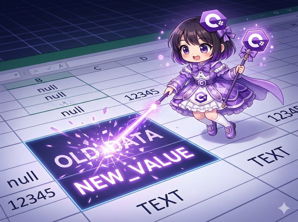 Excelの値を変更する際は、「行やセルが既に存在するかどうか」を確認するステップが不可欠です。NPOIでは行やセルが存在しない場合に null が返されるため、?? 演算子などを活用して「取得できなければ作成する」というロジックを組むことで、新規書き込みと更新の両方に対応できる堅牢なコードになります。