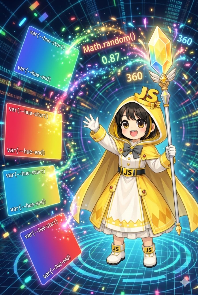 ボタンがクリックされるたびにランダムな色相(0〜360)を生成し、DOM要素のCSS変数を書き換えます。