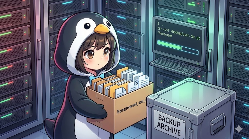 概要 Linuxシステムから不要になったユーザーアカウントを削除するためのコマンドです。 退職した社員のアカウントや、検証用に作成した一時的なユーザーをシステムから抹消する際に使用します。 重要な点として、「ユーザー情報だけを消す(ファイルは残... -