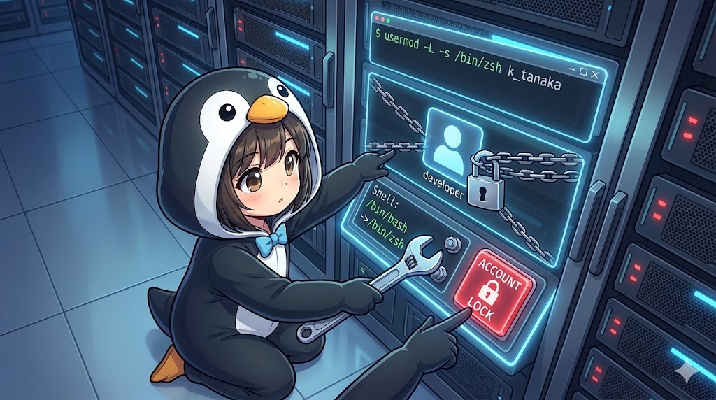 概要 作成済みのユーザーアカウント情報を、後から変更するためのコマンドです。 ログインシェルや所属グループの変更といった日常的な管理から、ログイン名(ユーザーID名)自体の変更、さらには不正アクセス対策としての一時的なアカウントロック(凍結... -