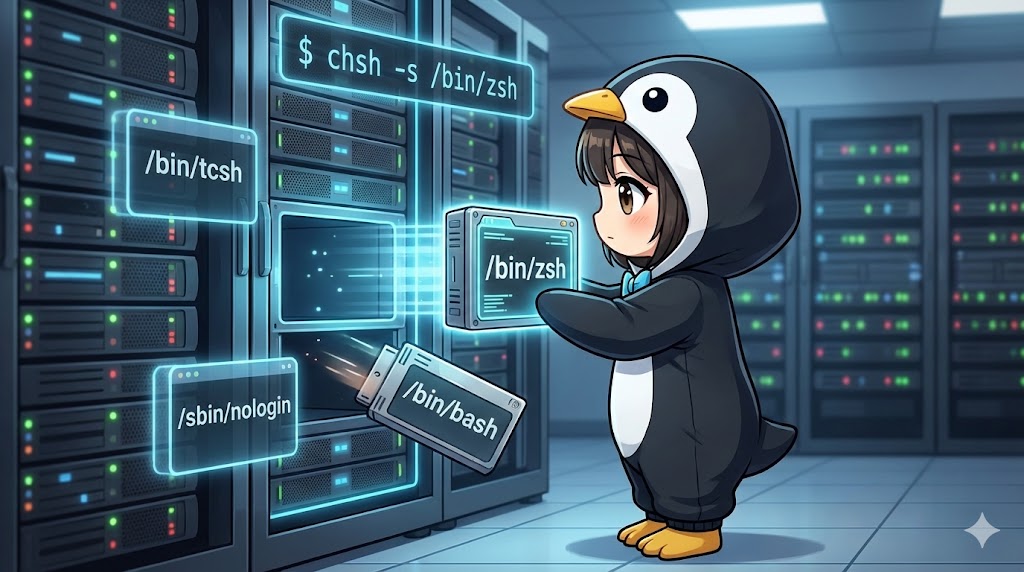 概要 ユーザーがターミナルにログインした直後に起動するシェル(ログインシェル)を変更するためのコマンドです。 bashからzshへの切り替えや、システム管理用ユーザーのシェルを無効化する場合などに使用します。変更内容はユーザーデータベース(/etc/p... -