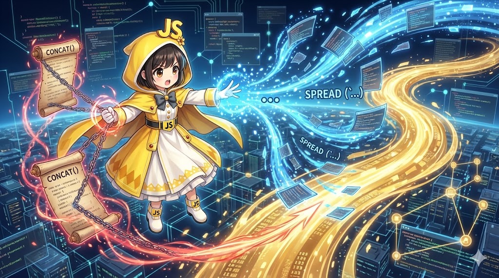 概要 複数のデータリストを1つにまとめたい場合、JavaScriptには伝統的な concat メソッドと、ES2015(ES6)で導入された直感的な「スプレッド構文(...)」の2つの方法があります。 現在では、可読性が高く柔軟な操作が可能なスプレッド構文が主流となって...