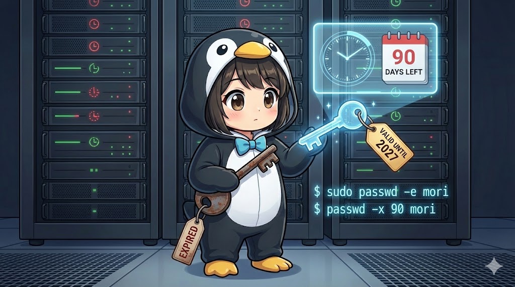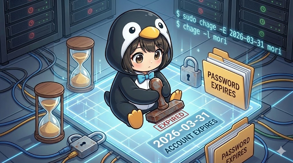 概要 ユーザーアカウントのパスワード有効期限(Expiration)や、パスワード期限切れ後の猶予期間、アカウント自体の失効日などを詳細に管理・表示するためのコマンドです。 定期的なパスワード変更を強制するセキュリティポリシーの運用や、契約終了日に... -